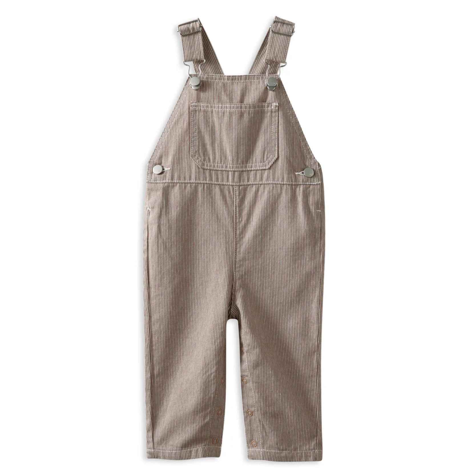 Crafted from a durable, thick woven fabric, these charming latte stripe overalls are designed to protect little crawling knees while adding a stylish touch to everyday outfits.