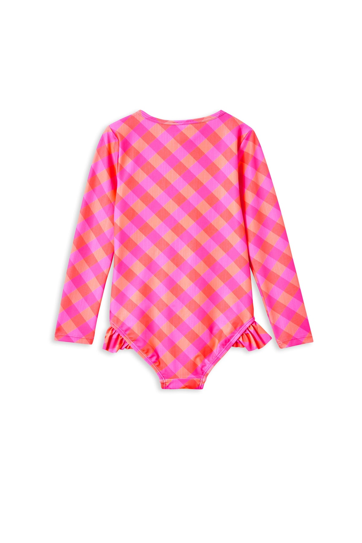 Milky Clothing Check Long Sleeve Swimsuit. Keep the sun off their skin and the wind from their shoulders with the Check Frill Long Sleeve Swimsuit. This swimsuit has full-length sleeves and a UPF 50+ rating. Complete the look with our Check Swim Hat and stay sun smart this Summer with Milky Clothing.