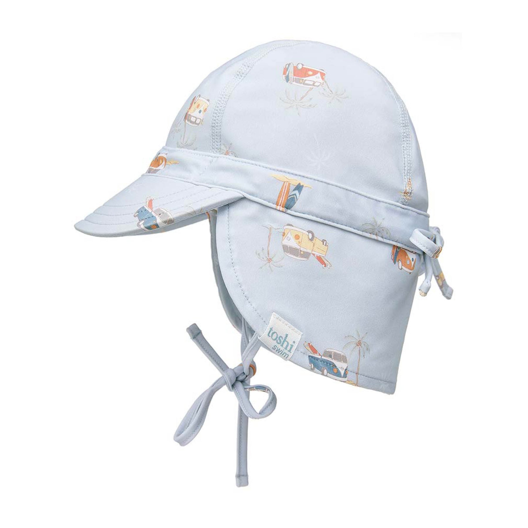 Toshi Swim Flap Cap Beach Bums features an original and exclusive Toshi print design; a vintage inspired surfing safari is presented in an ocean blue hue.