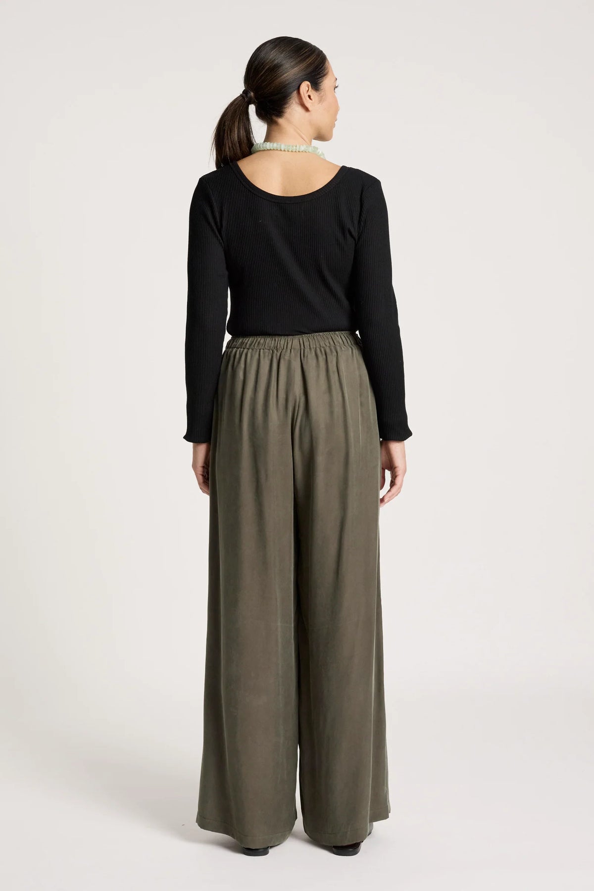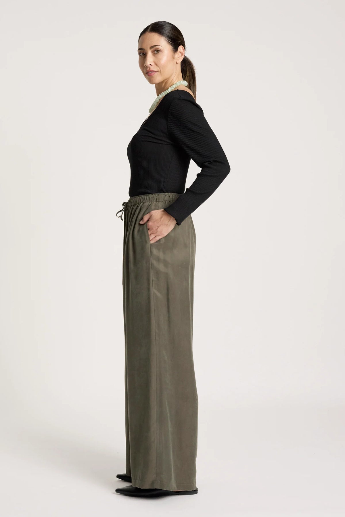 A refined straight-leg pant crafted from a soft, fluid cupro blend. Designed with an elasticated waistband and adjustable drawstring, and finished with subtle gold hardware for a polished touch.