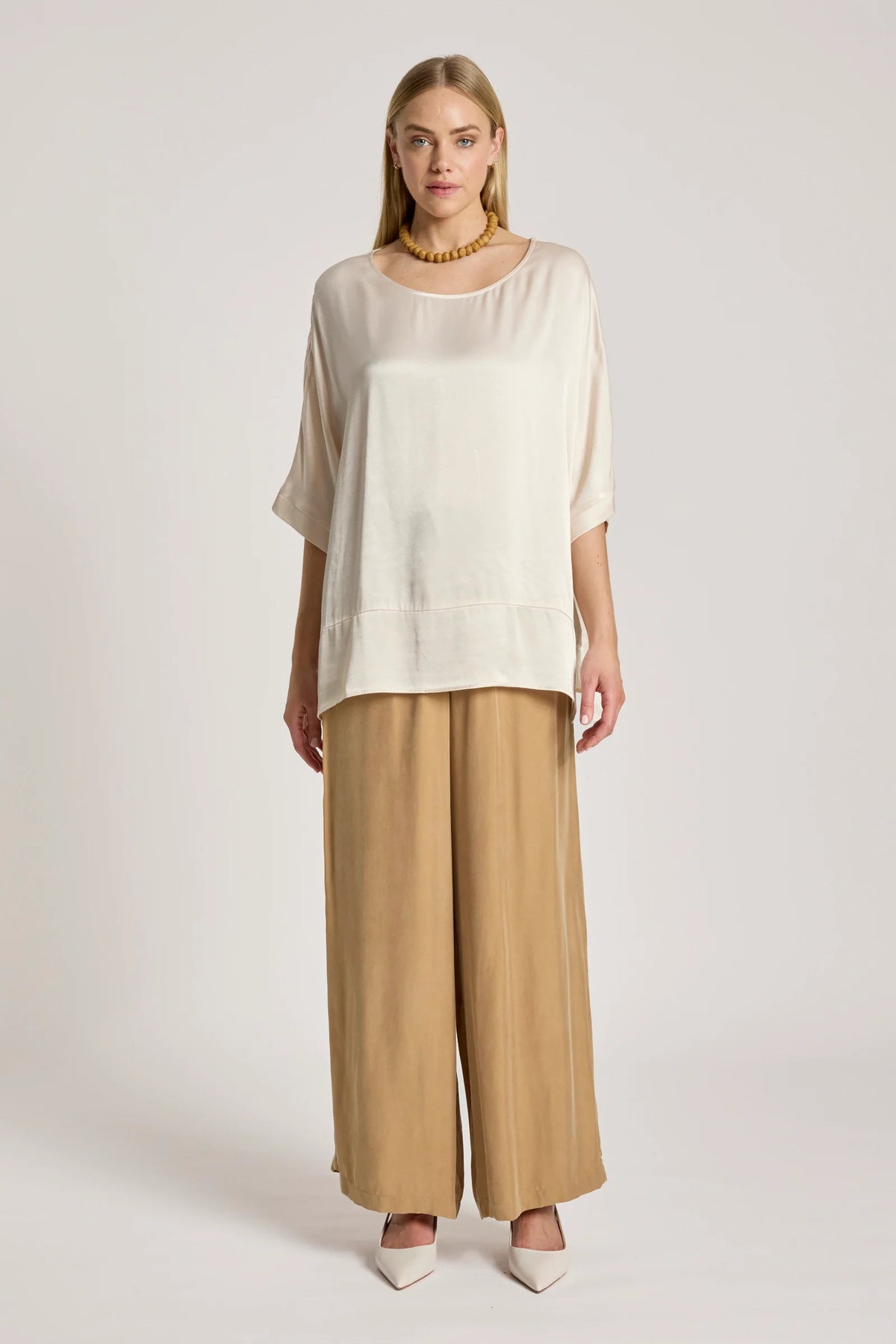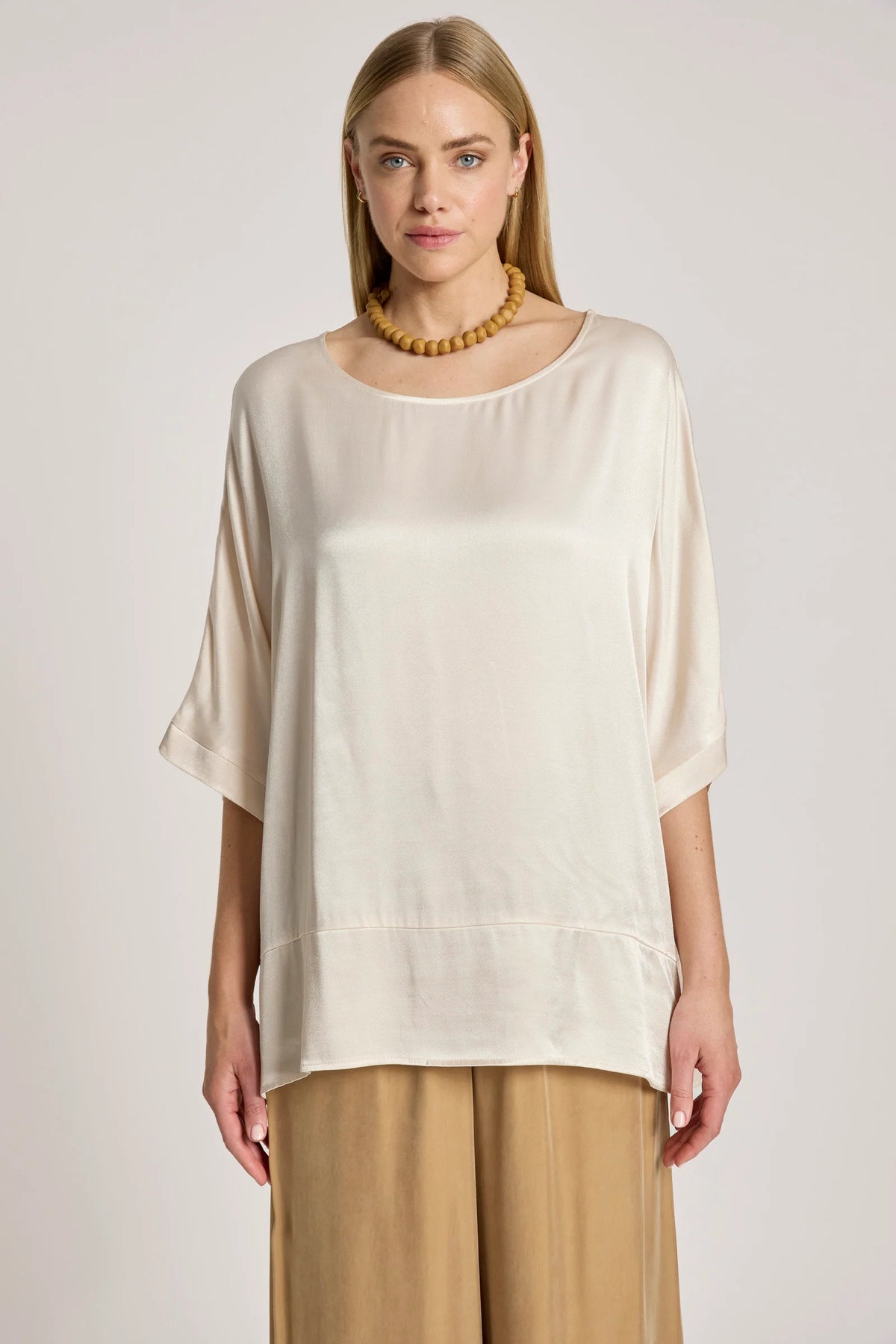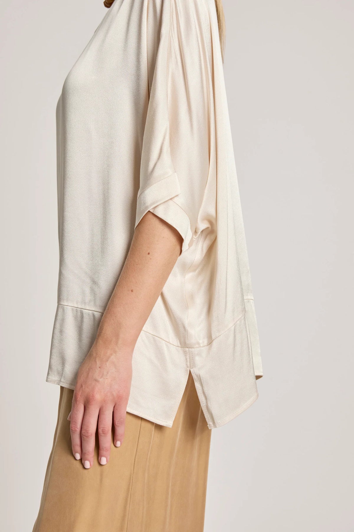 A softly draped top crafted from a lightweight fabric with a subtle sheen. Designed in a relaxed one-size silhouette, it features a wide hem detail that creates gentle shape while maintaining an effortless, easy fit.