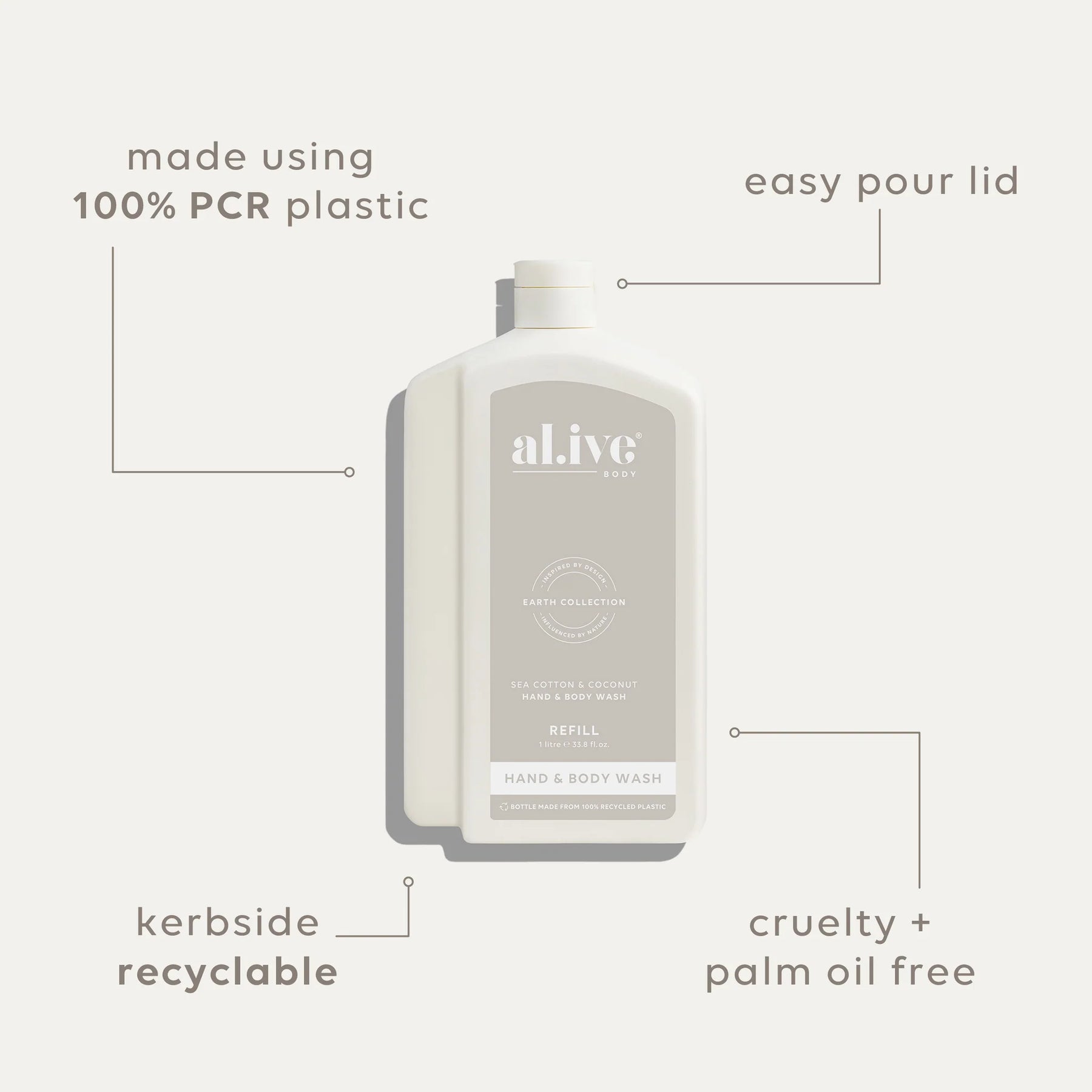 Each refill is designed to refill the 500ml al.ive body Hand & Body Wash bottle twice. With a controlled-flow spout for mess-free pouring, a compact shape for easy storage, and full kerbside recyclability, it offers a practical, premium solution that extends the life of the product you already love.