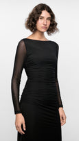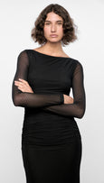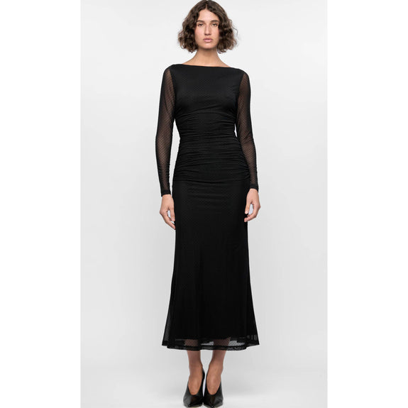 The Kaia Mesh Maxi Dress is your go-to for sleek sophistication. With subtle spot texture, ruched waist and sheer sleeves, it’s the perfect after-dark silhouette.